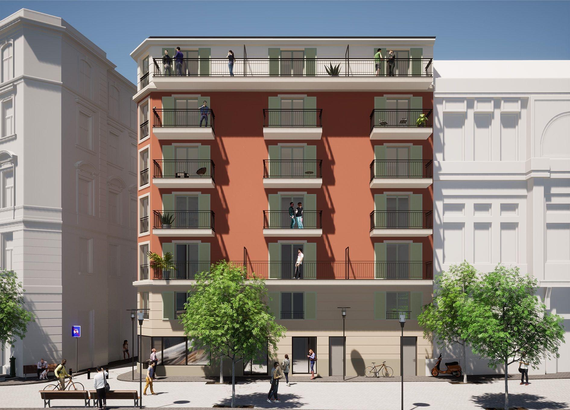 Avec sa façade rouge, ses volets verts et ses fenêtres ourlées de blanc, la résidence Angleterre reprend les codes architecturaux de la Riviera et se glisse avec fierté et légèreté dans le centre-ville de Nice.